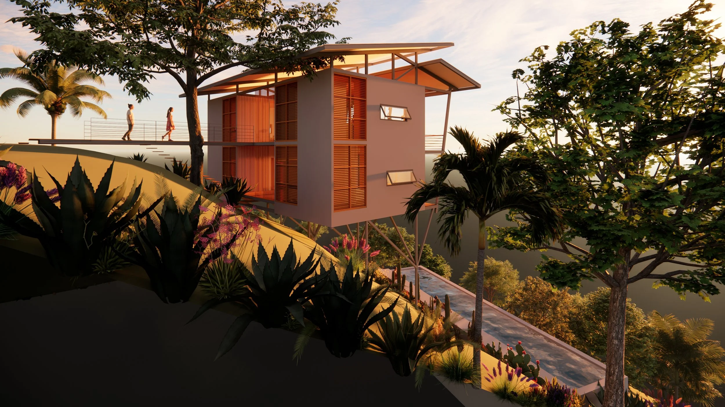 Biophilic concept design maximizes ocean views and sounds, jungle acoustics, and river valley breezes. Wildlife corridors and planned food forest in the lower irrigated area create immersive natural living.